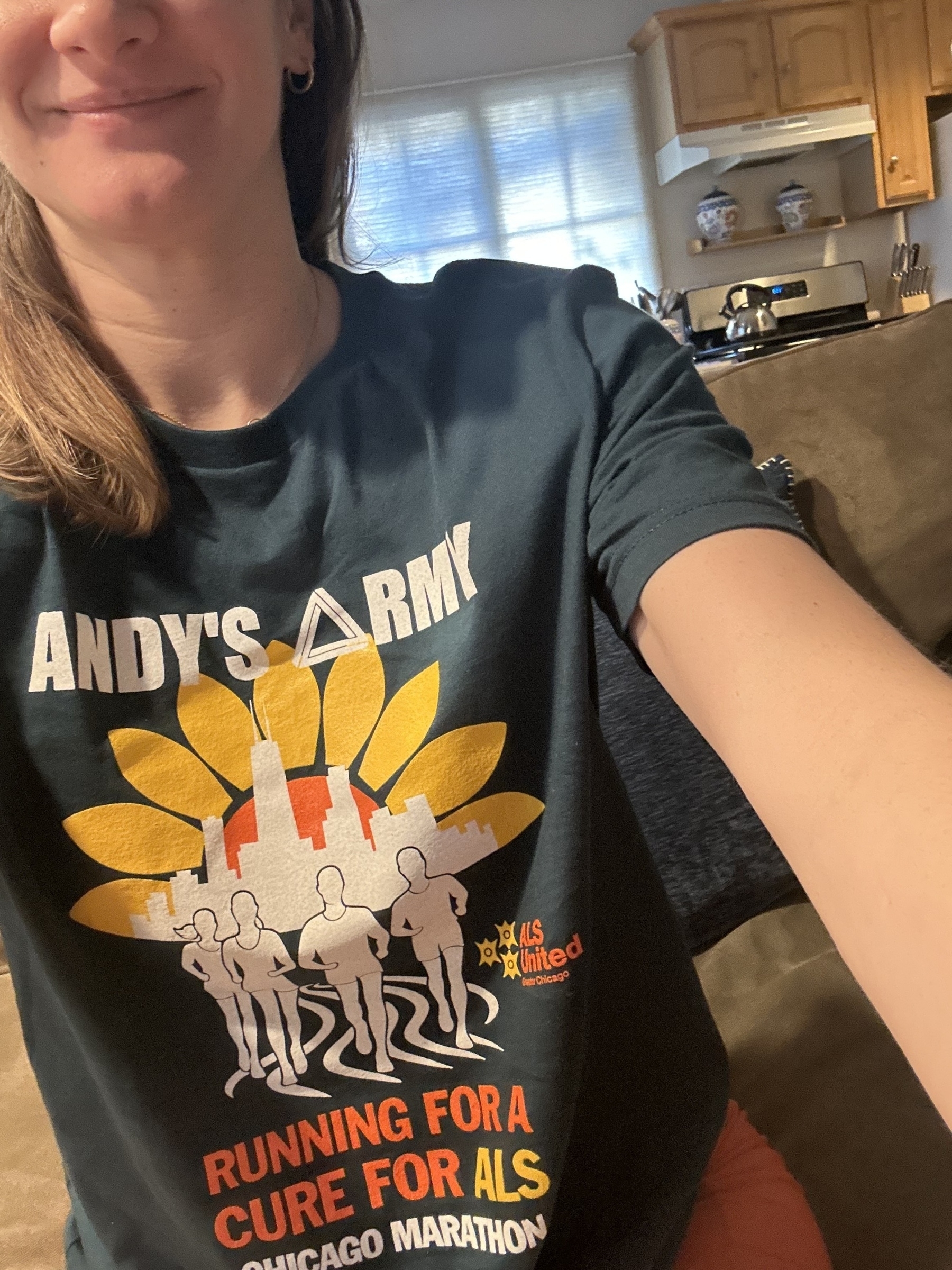 Now’s the time to commit! If you’re even thinking about running, send an email to Sarah Brandt at Sarah@alsunitedchicago.org to get details on how to register for a charity spot and join Andy’s Army. You’ll have fun, support a great cause—and get a pretty cool T-shirt in the process.