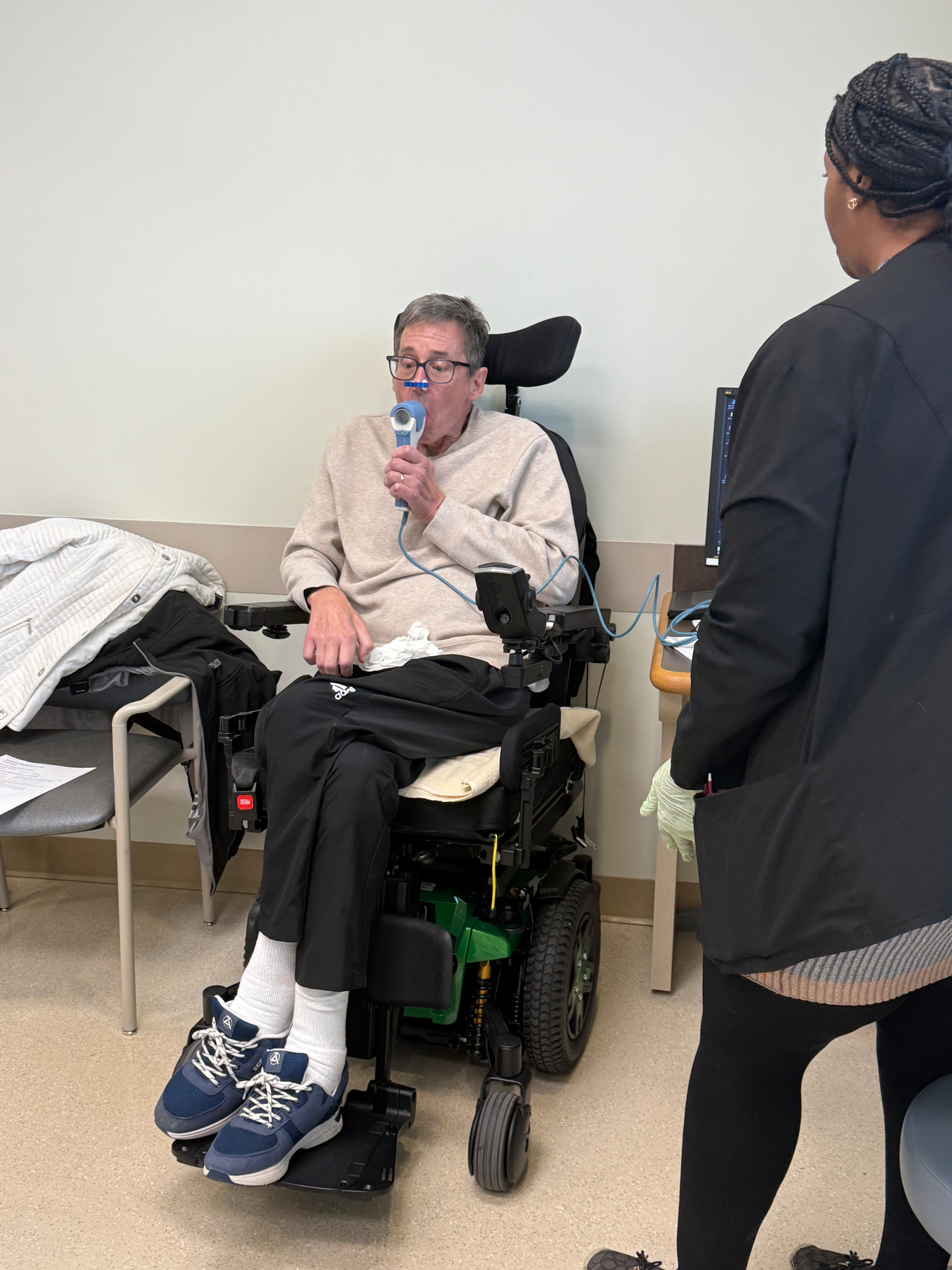 In the exam room, pulmonary testing came next. I’ve done these breath tests many times. In the early days I could inhale and exhale forcefully for 7–10 seconds. Yesterday it was more like 2–4 seconds, without much strength behind it. I didn’t need anyone to interpret the results. I could feel them.